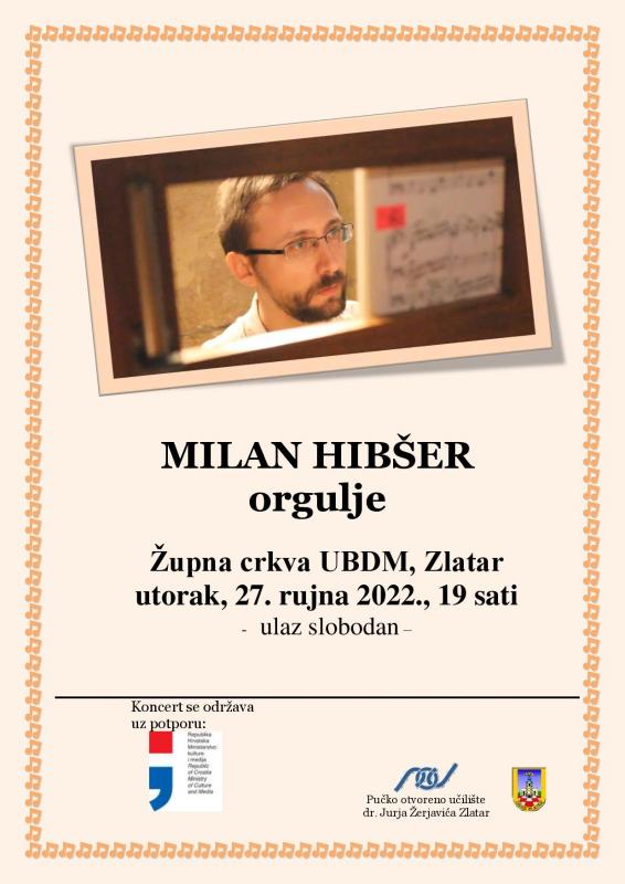 Milan Hibšer diplomirao je filozofiju i religijsku kulturu na Filozofskom fakultetu Družbe Isusove u Zagrebu te orgulje na Institutu za crkvenu glazbu Katoličkog bogoslovnog fakulteta u Zagrebu, a magistarski studij orgulja i sakralne glazbe završio je na Akademiji za glasbo u Ljubljani. Uz brojna usavršavanja u zemlji i inozemstvu, nastupao je širom Hrvatske na gotovo svim orguljaškim festivalima i gostovao u više europskih zemalja. Snimio je nekoliko CD-a te je dobitnik nagrada za skladateljski rad. Glavni je orguljaš u bazilici Sv. Antuna Padovanskog na Sv. Duhu u Zagrebu, a u statusu docenta predaje na Institutu za crkvenu glazbu Katoličkog bogoslovnog fakulteta u Zagrebu. Na programu zlatarskog koncerta su djela J. S. Bacha, J. Bajamontija, D. Buxtehudea, W. A. Mozarta i A. Klobučara. Ulaz je slobodan.